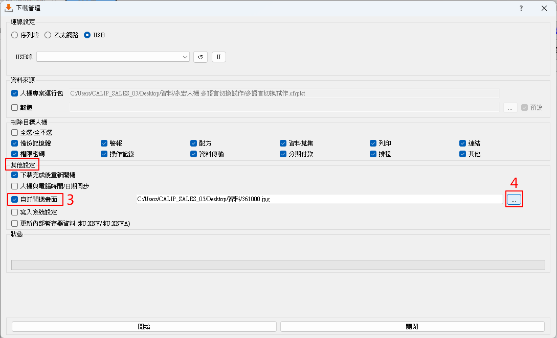 勾選"其他設定"中 ☑【自訂開機畫面】→點選右側【…】選擇圖片路徑匯入